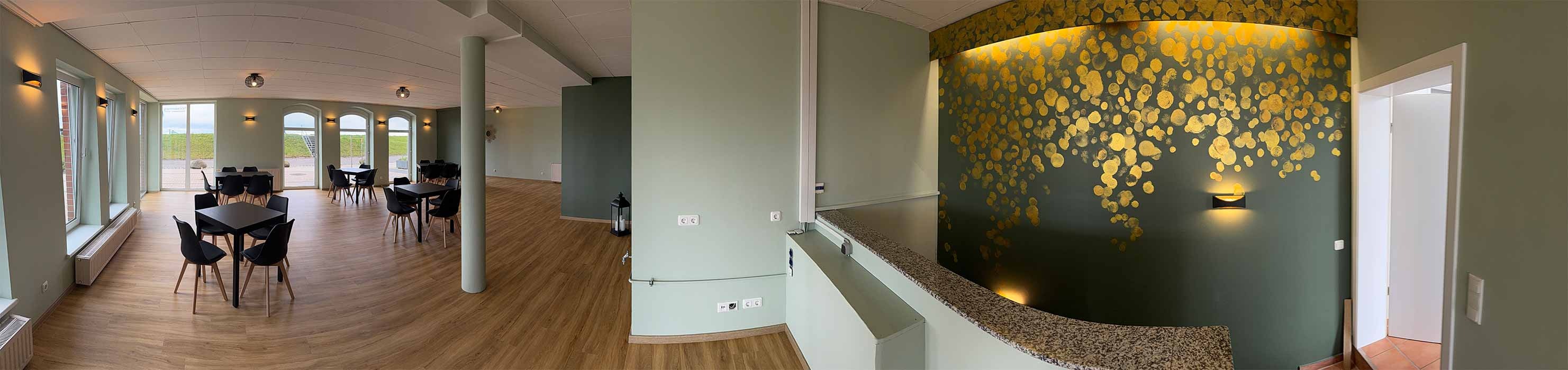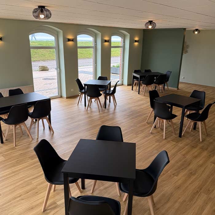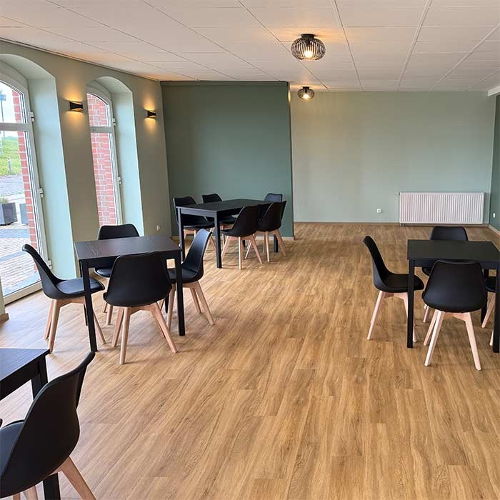 Der helle Holzfußboden und die stilvolle Beleuchtung unterstreichen das zeitgemäße Ambiente. Ob für kleine Veranstaltungen, gesellige Runden oder einfach eine Tasse Kaffee am Nachmittag – der neue Aufenthaltsraum ist ein Treffpunkt für Gäste und Bewohner, der Gemeinschaft fördert und gleichzeitig Raum für persönliche Momente lässt.